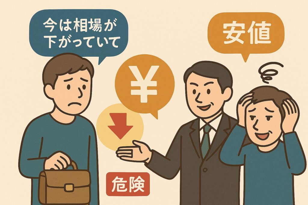 - 「今は相場が下がっている」「キズが多いから値段がつかない」などと説明し、実際の市場価格より大幅に安い金額を提示。