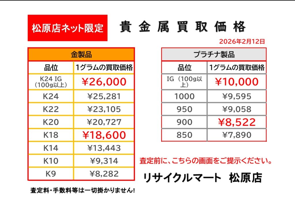 2026年2月12日 本日の金・プラチナの 買取価格は?リサイクルマート松原店