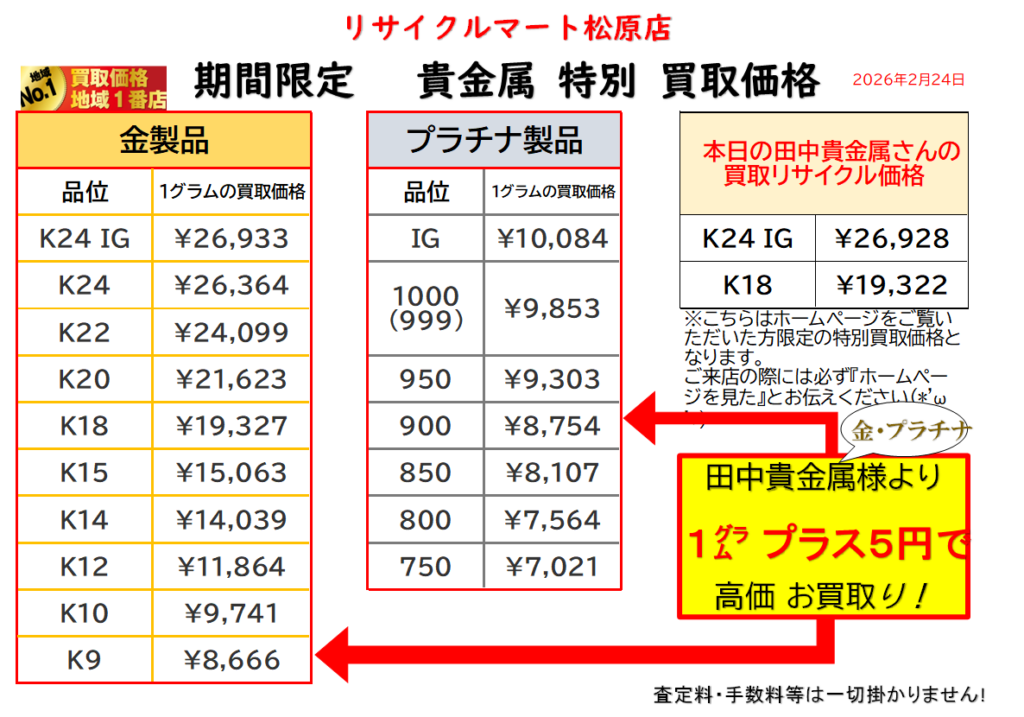 金・プラチナ 高価買取!田中貴金属より高く買います!リサイクルマート松原店