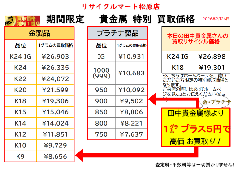 金・プラチナ 高価買取!田中貴金属より高く買います!リサイクルマート松原店