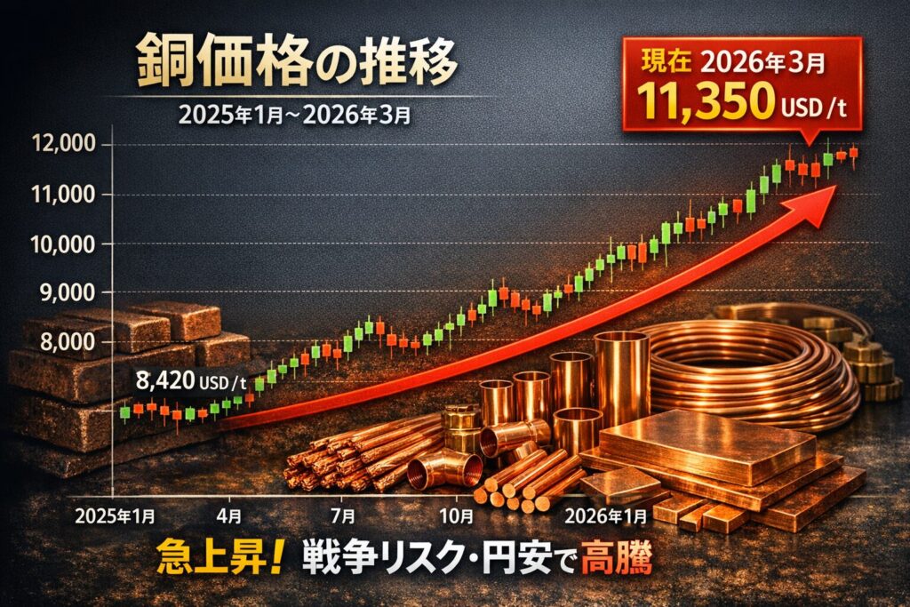 銅価格の推移を見ると、2024年の一時的な下落を経て、2025年に反発し、2026年にかけて急速に上昇していることがわかる。特に2026年2月〜3月は、世界情勢の不安定化と円安が重なり、国内価格はさらに押し上げられた。