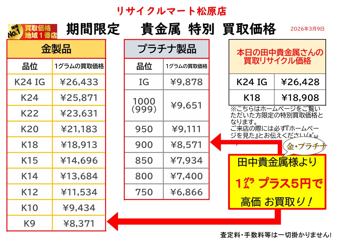2026年3月9日 本日の金・プラチナの 買取価格は?リサイクルマート松原店