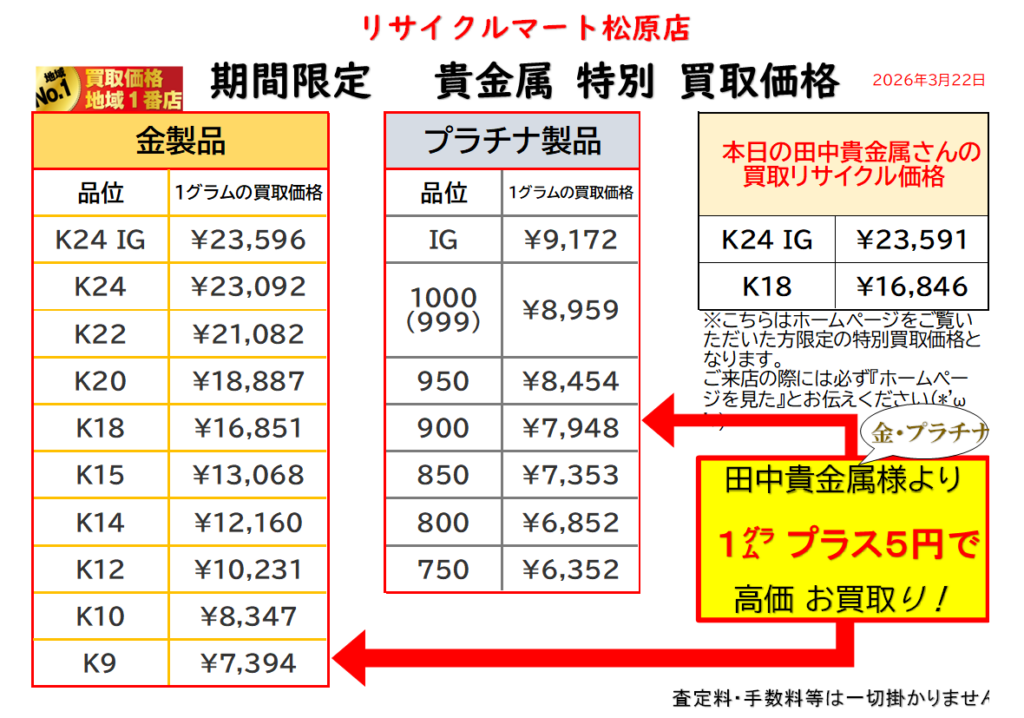 松原市の「リサイクルマート松原店」でも、 「金・プラチナって今売り時?」 「昔買った指輪、今いくらになる?」 といったご相談が増えています。