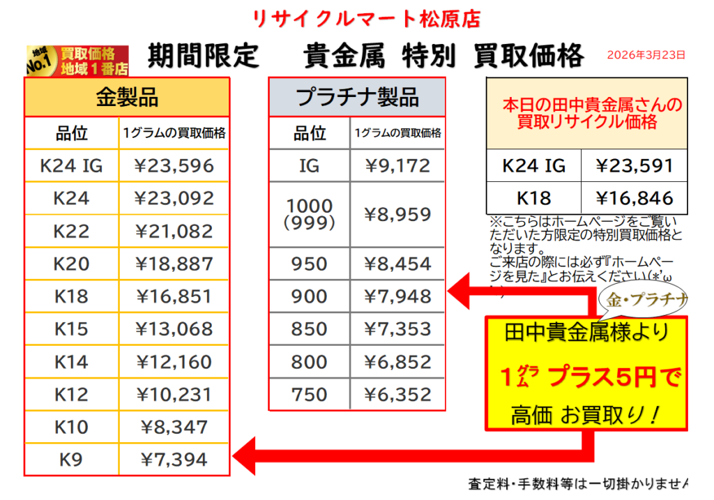 松原市の「リサイクルマート松原店」でも、 「金・プラチナって今売り時?」 「昔買った指輪、今いくらになる?」 といったご相談が増えています。