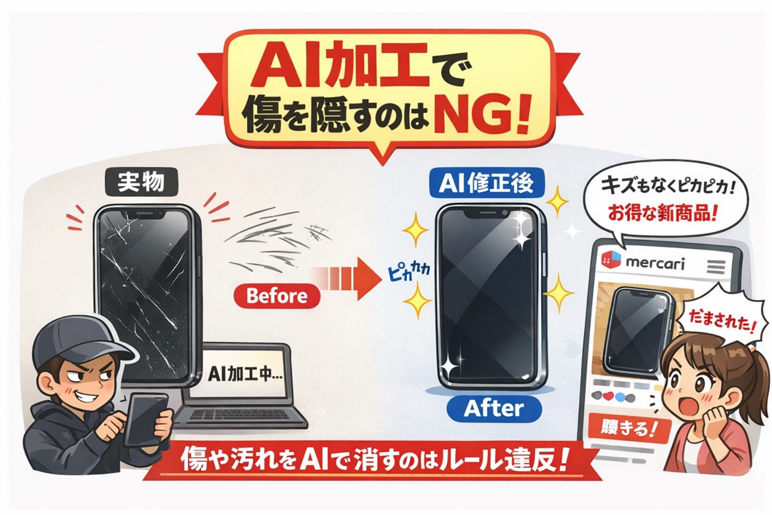こうした行為が横行し、メルカリは公式に 「AI画像の虚偽利用は禁止」 と明記するほど深刻な問題になっています。