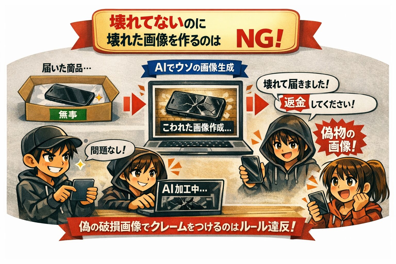 AI画像による虚偽クレーム詐欺を図解で解説。壊れてない商品でも返金要求はルール違反!
