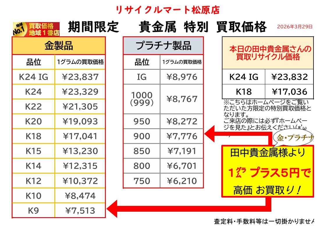 2026年3月29日 本日の金・プラチナの 買取価格は?リサイクルマート松原店