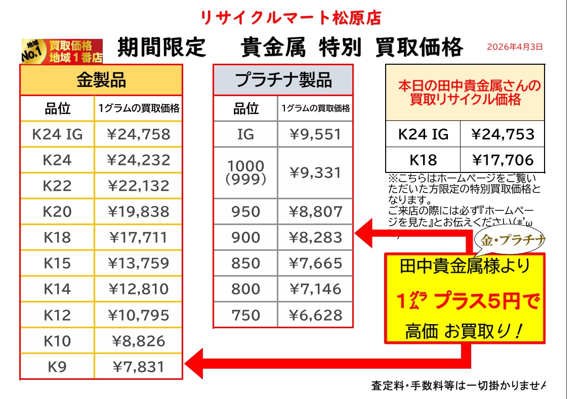 令和8年4月3日 本日の金・プラチナの 買取価格は?リサイクルマート松原店