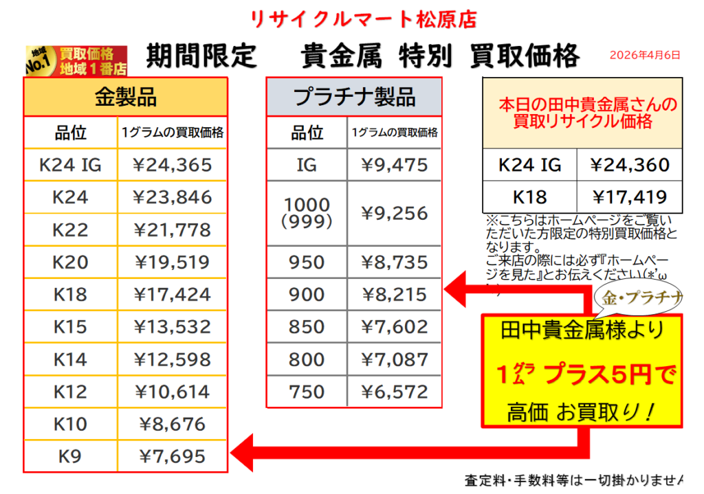 松原市の「リサイクルマート松原店」でも、 「金・プラチナって今売り時?」 「昔買った指輪、今いくらになる?」 といったご相談が増えています。