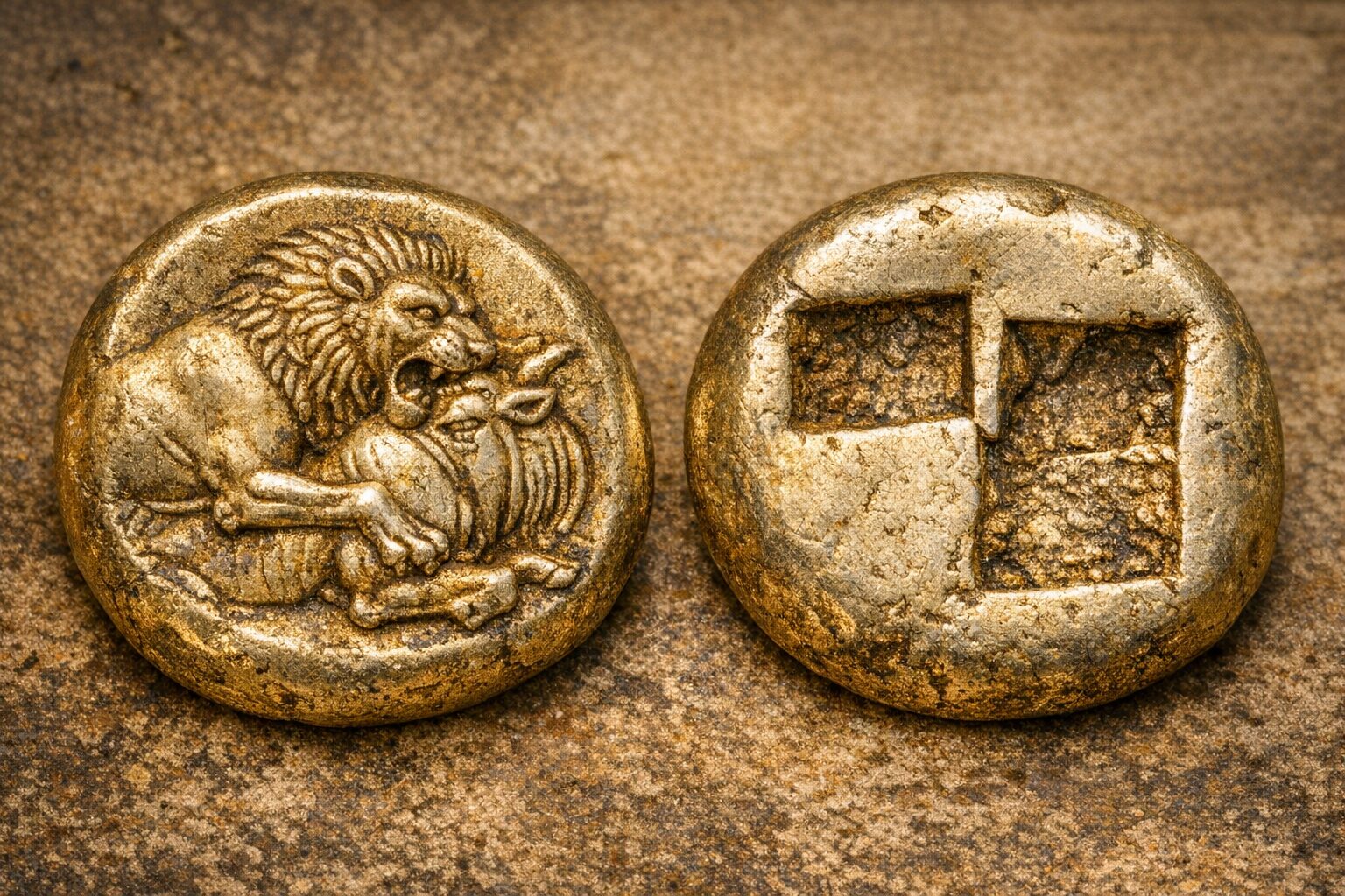 世界初の金貨「エレクトロン貨」が登場し、 ここから金は 「価値の基準」=貨幣 としての歴史を歩み始めます。