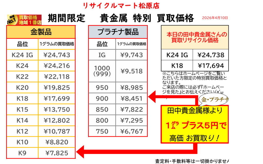 令和8年4月10日 本日の金・プラチナの 買取価格です。リサイクルマート松原店