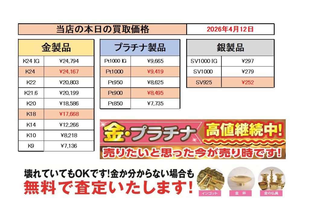 現在、金の相場は歴史的な高水準を維持しており、金を売却する絶好のタイミングです。当店では、松原市の皆様に喜んでいただけるよう、貴金属の高価買取に全力を注いでおります。