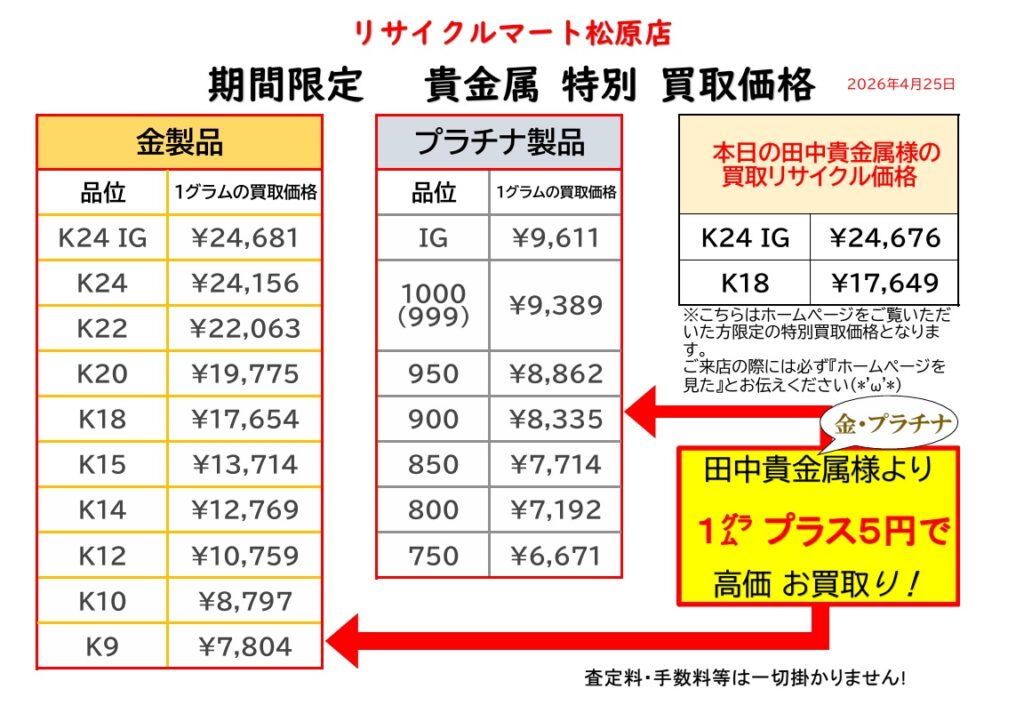 令和8年4月25日 本日の金・プラチナの 買取価格です。リサイクルマート松原店