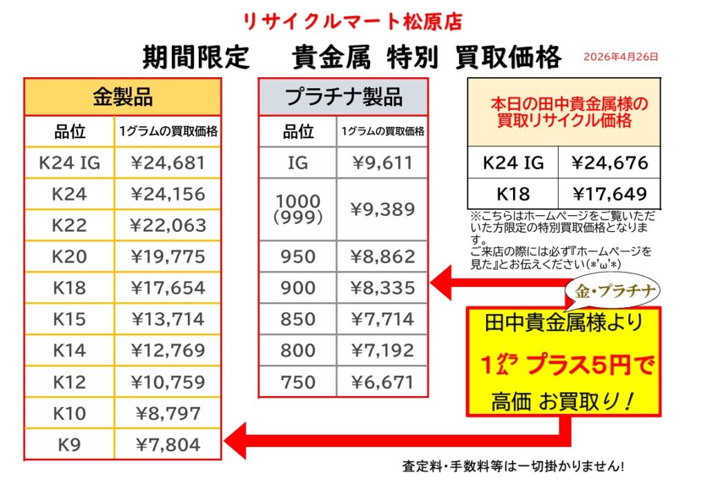 令和8年4月26日 本日の金・プラチナの 買取価格です。リサイクルマート松原店