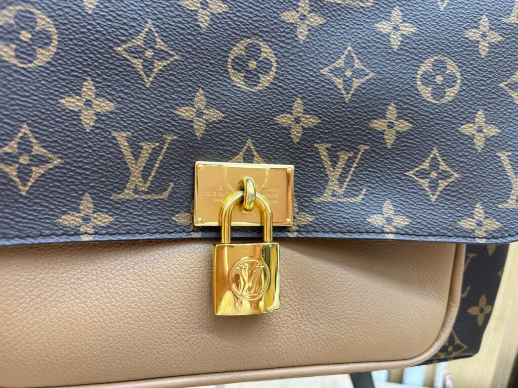 モノグラムキャンバスにベージュのレザーが組み合わされた、洗練されたデザイン。ゴールドのロック金具がアクセントになっていて、フォーマルにもカジュアルにも使える万能モデルです。