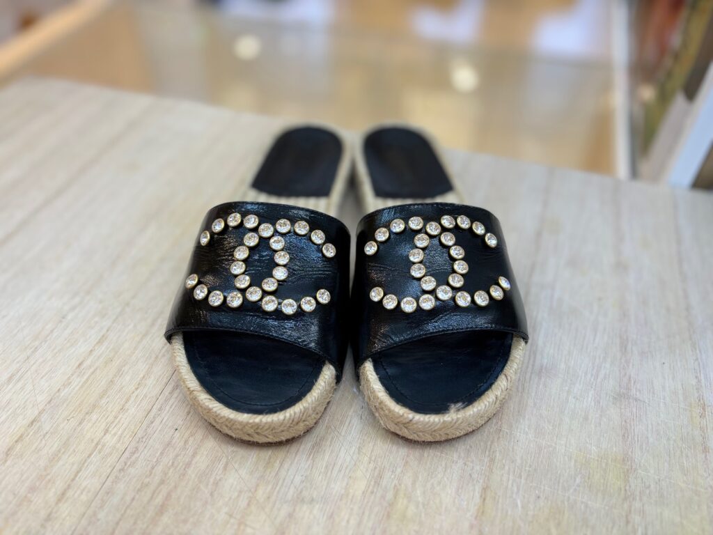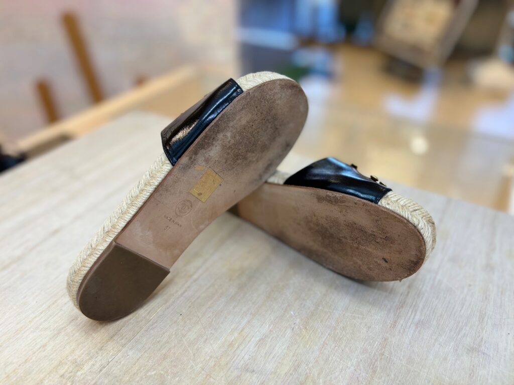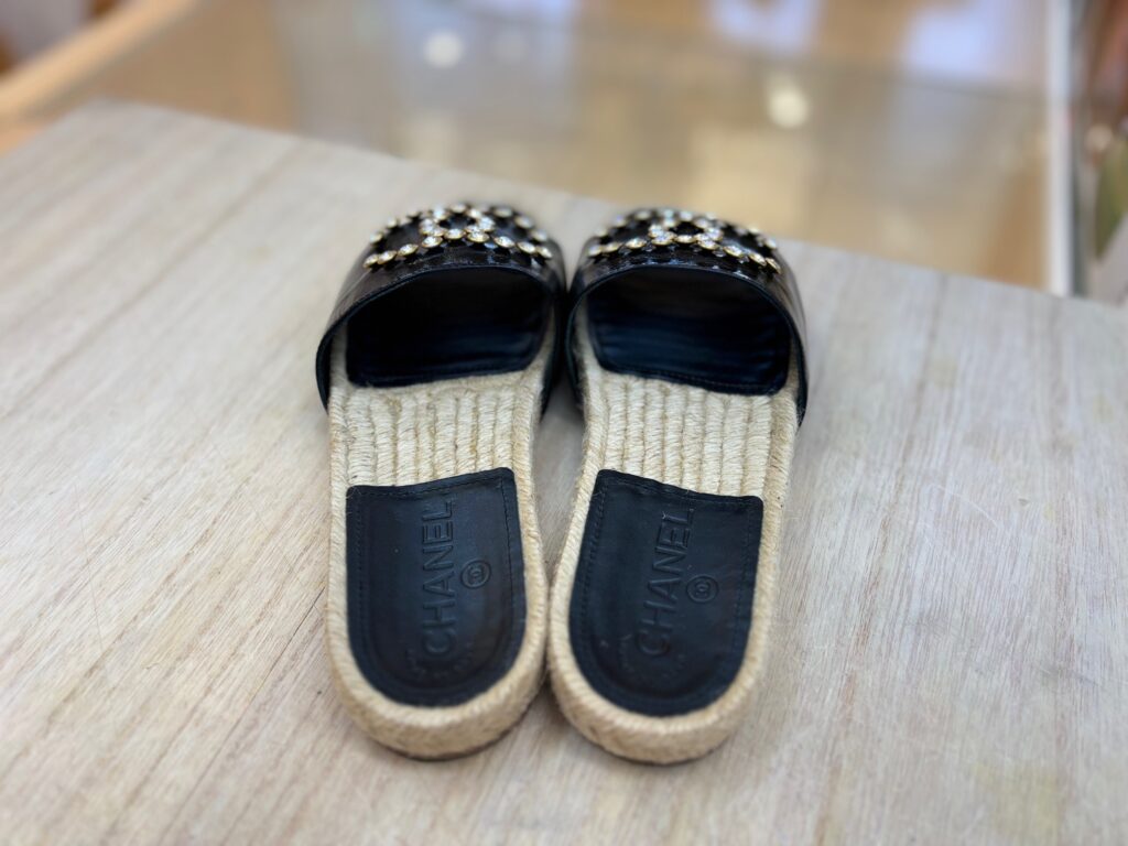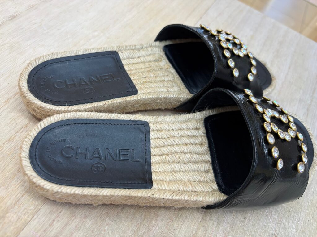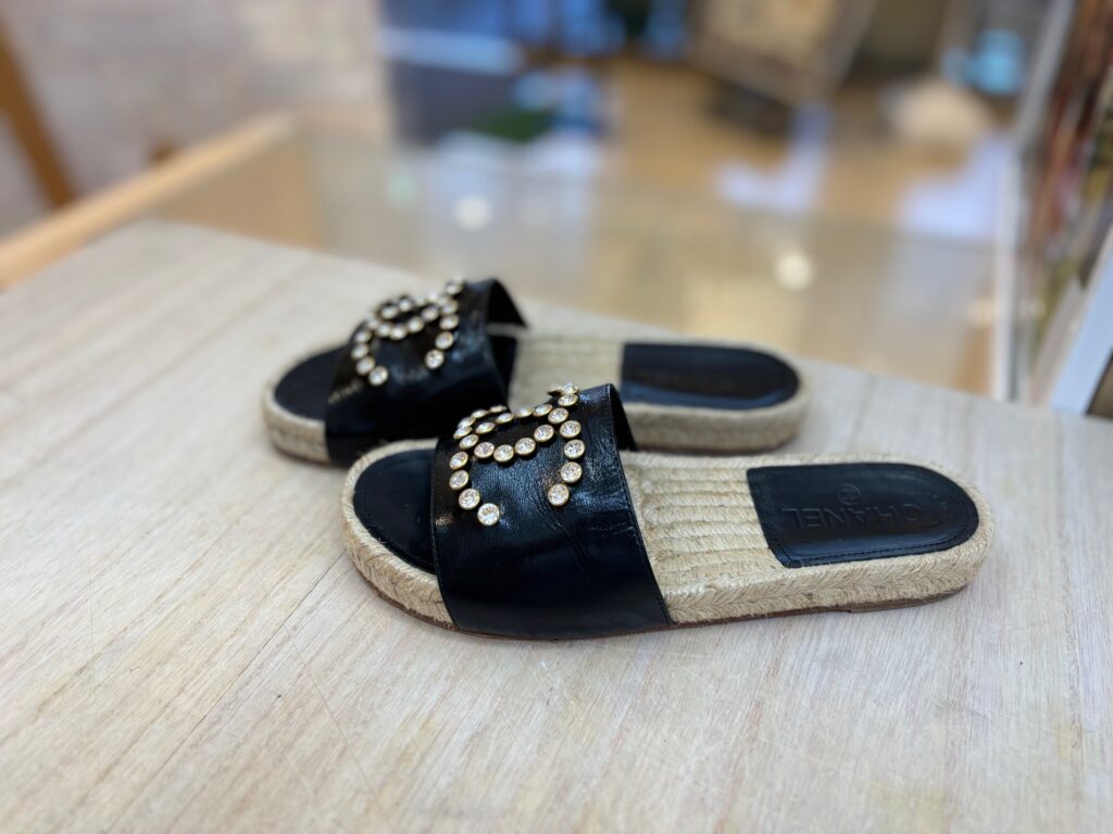 今回お持ち込みいただいたのは、シャネルの「ココマーク エスパドリーユ ミュールサンダル」。ブラックレザーにラインストーンで描かれたココマークが輝く、もう秋ですが・・・・夏らしさとラグジュアリー感を兼ね備えた一足です。