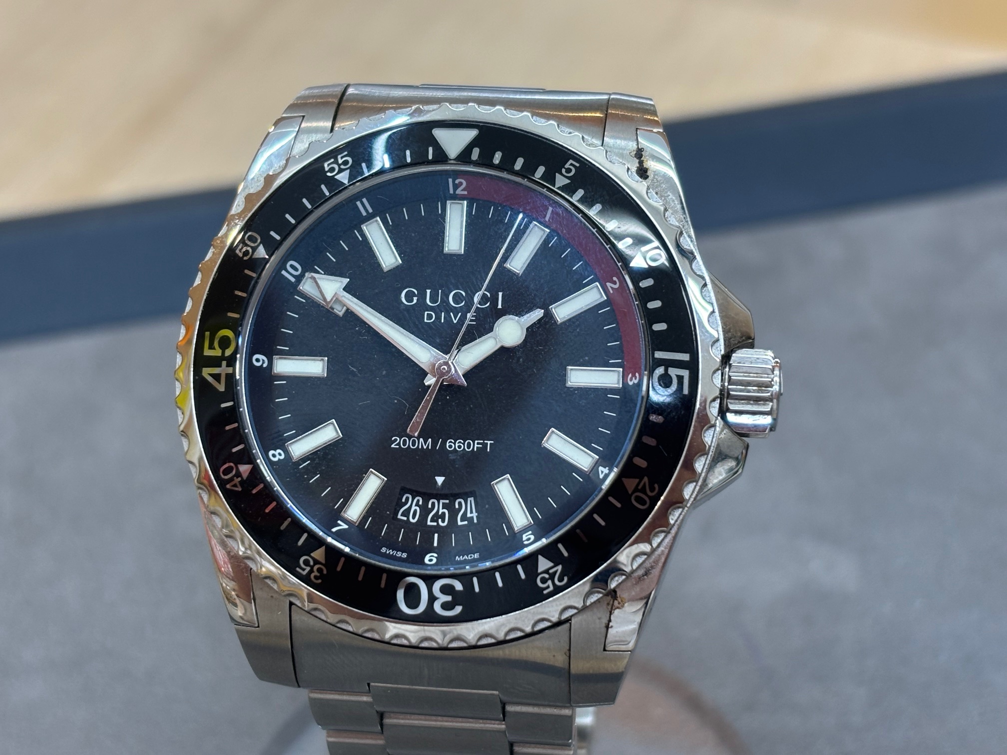 今回お持ち込みいただいたのは、グッチの「136.2」モデル。 200m防水仕様で、スポーティーかつ洗練されたデザインが特徴です。ビジネスにもカジュアルにも合わせやすく、幅広い層に支持されています。