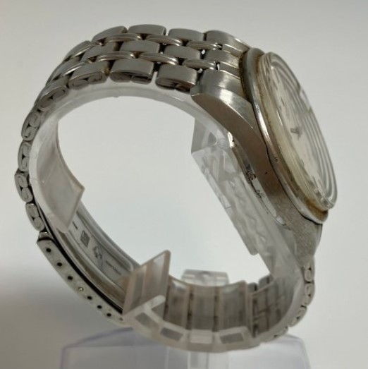 今回お持ち込みいただいたのは、Ref.869112の自動巻きモデル。 シルバーのラウンドケースに、クラシカルなインデックスとデイト表示。 ブレスレット一体型のデザインで、ヴィンテージらしい風格が漂っています。