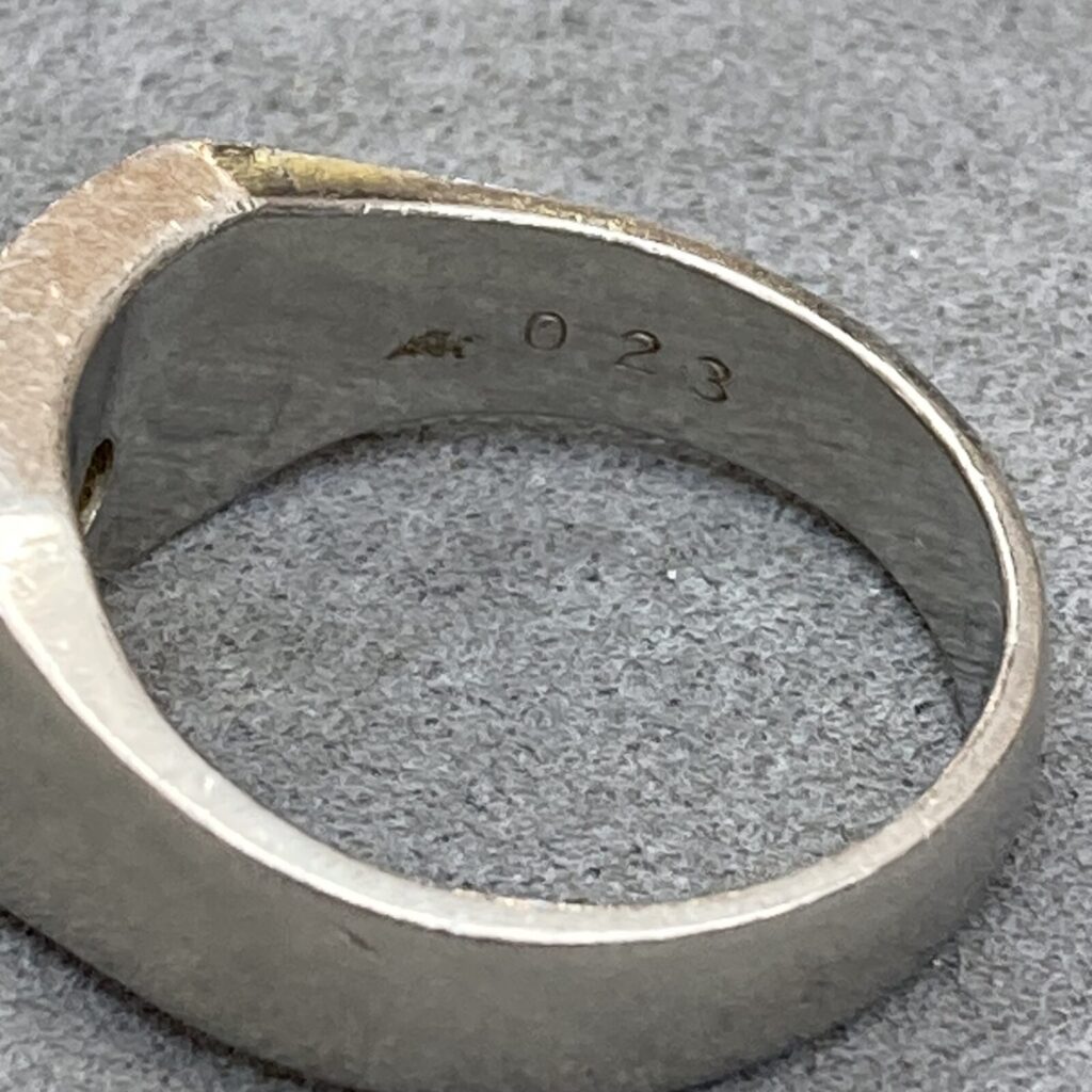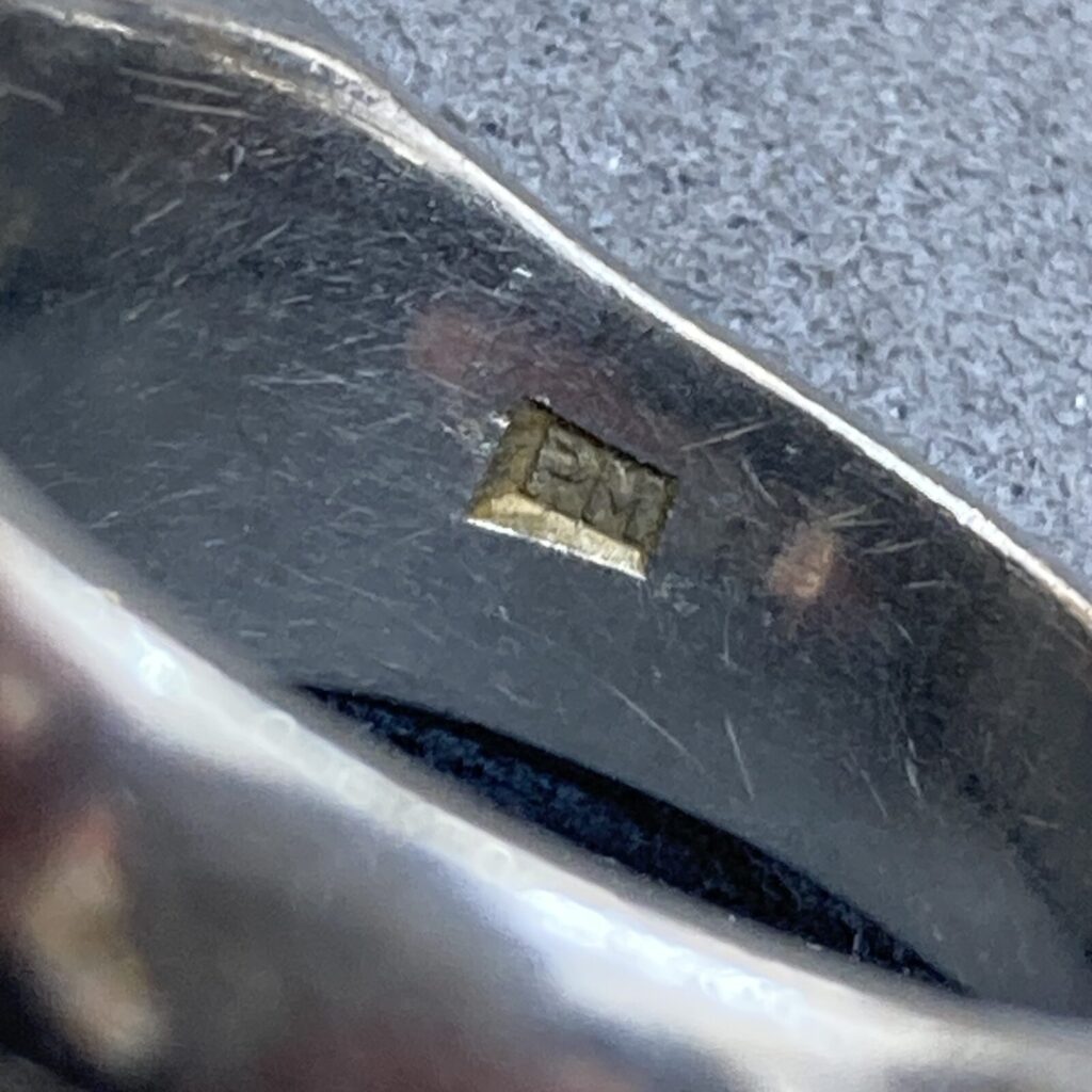 を見ると、指輪の内側に「PM」という刻印が確認できます。これは、現代の「Pt(プラチナ)」表記が一般的になる前に使われていた古い刻印です。 「昔のプラチナは偽物が多いのでは?」と不安に思われる方もいらっしゃいますが、ご安心ください。「PM」は「Platinum」の略称であり、多くは昭和初期から中期にかけて日本で作られた良質なジュエリーの証です。