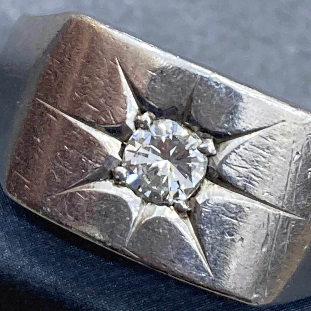 今回お持ち込みいただいたのは、爪を使わずにダイヤモンドを地金に埋め込み、その周囲に光が差したような彫刻を施した**「後光留め(星留め)」**と呼ばれるデザインのリングです。引っかかりが少なく、普段使いしやすいデザインとして昭和の時代に愛されたスタイルです。