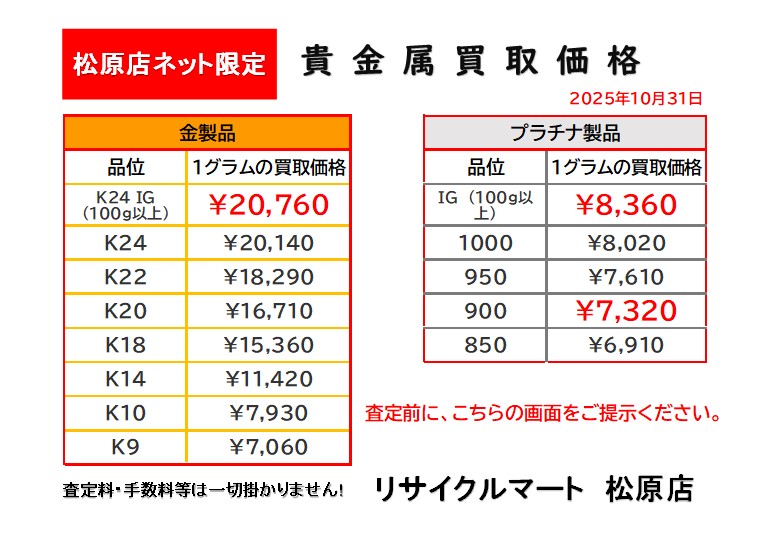 クーポン 2025/10/3110月31日 今日は上がった?本日の貴金属 買取価格! リサイクルマート松原店