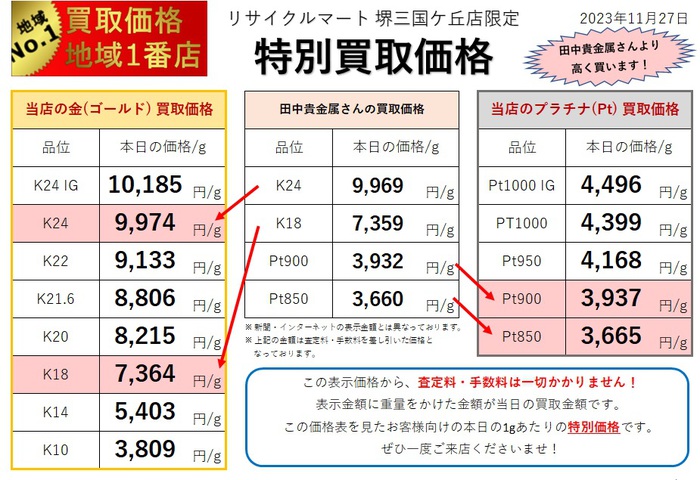 2023年11月27日 【史上最高価格更新!!】貴金属買取価格、1g10,185円!! リサイクルマート堺三国ケ丘店