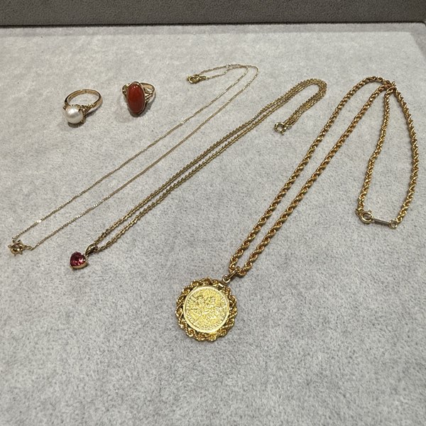 日付 2025/11/21金 ゴールド コイン アクセサリー名称 メープルリーフ金貨付デザインネックレス、K18ネックレス、K18リング買取価格351,500 円 -