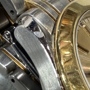 買取時の査定ポイントとしては、ケースやベゼルのキズ、ブレスのたるみ、箱、ギャランティカード、コマなど付属品の有無となってきます。