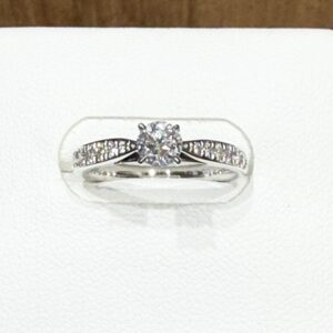0.315キャラットのダイヤモンドをメインに両サイドにメレダイヤが配置されているプラチナ950地金製の指輪です。