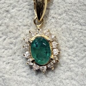 0.7キャラットのエメラルドをメインに周りにメレダイヤが配置されている18金地金製のネックレスです。