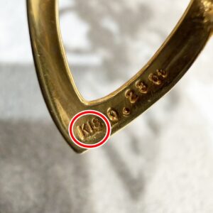 リングの内側、チェーン留め具部分、イヤリングの側面などに品位の刻印があります。