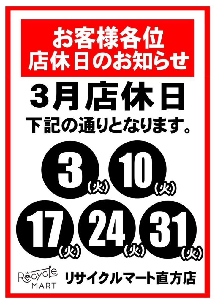 2026年3月の店休日のお知らせです。