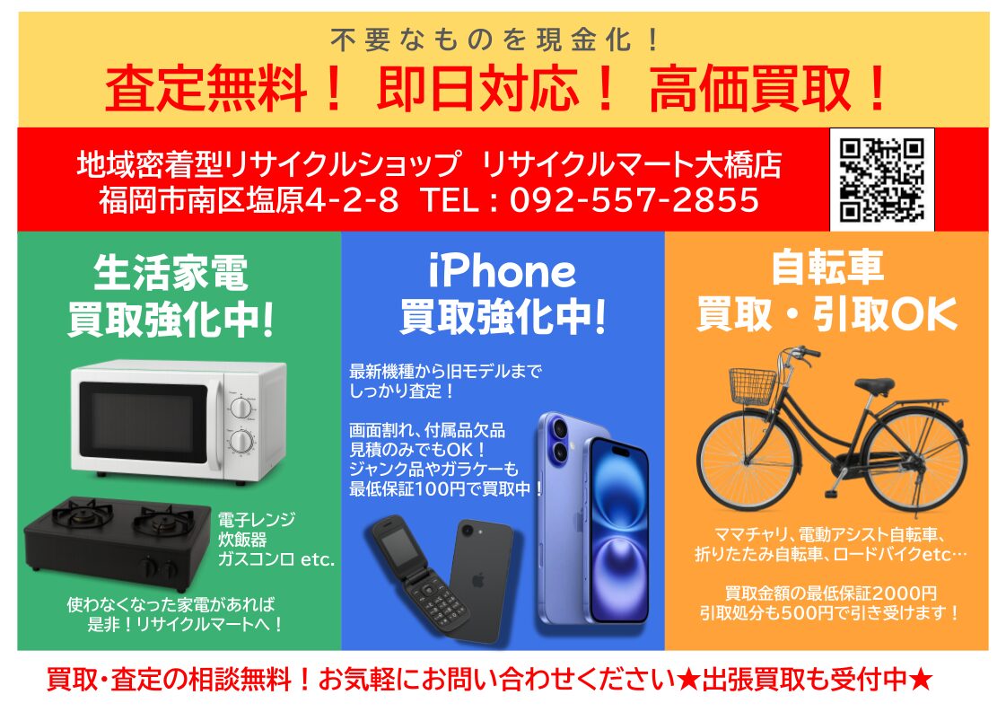 大橋店では生活家電・iPhone・自転車の買取を強化中!