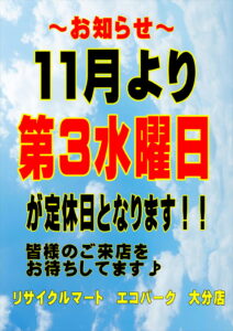 11月より定休日が第三水曜日となりますm(_ _”m)