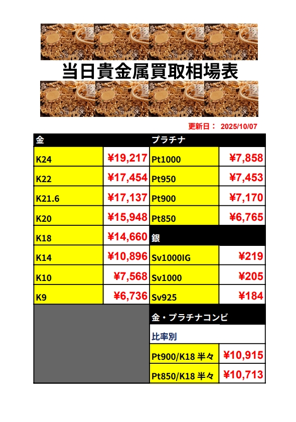 2025年10月7日 金・プラチナ・銀(シルバー)の買取相場