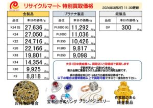 2026年3月2日 金 貴金属 買取価格 静岡市 静岡駅