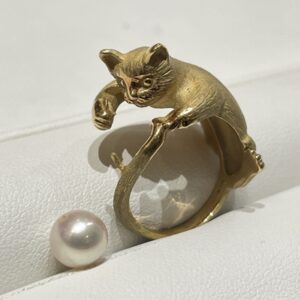 猫がパールを今にもツンツンと触りだしそうなデザインで猫好きにはたまらないリングです。デザイン性はありますが、お持ち込みのさいにパールは外れてしまっている状態でしたので貴金属の価値での買取となりました。パールは傷がつきやすい為、リングに付いている状態でも大きさやテリなどによりお値段に差が出ます。