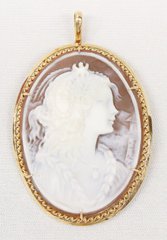 カメオ(Cameo)は、主に貝殻や瑪瑙(めのう)などを素材に、浮き彫りの技法で人物や風景を彫刻した装飾品です。古代ギリシャ・ローマ時代にルーツを持ち、18世紀から19世紀のヨーロッパでは、上流階級の女性たちが愛用するジュエリーとして広まりました。