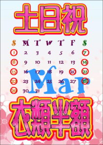 3月は、土日祝日衣類半額です。