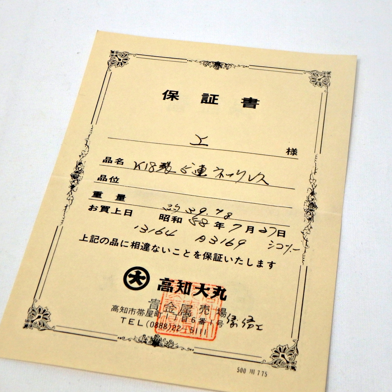 保証書から昭和58年(1983年)購入と分かるため、当時の金価格を国際相場などから推論すると、18K金はおおよそ1gあたり2,000円前後だったと考えられます(参考推論値)。