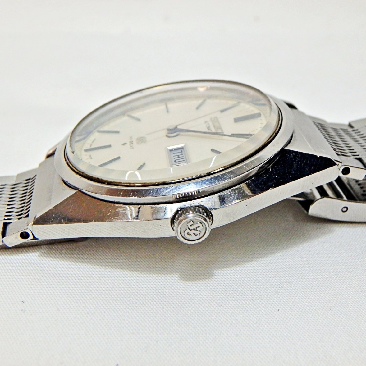 このメダリオンは、当時のグランドセイコーの特徴の一つ。長年使用されるうちに摩耗したり、剥がれてしまう個体も少なくありません。そのため、この部分の状態を気にされるコレクターもいます。