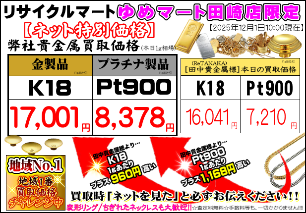 【12月1日(月曜)】本日のネット限定!!!! 金・プラチナ買取相場情報❢❢ 毎日更新ʕ•̀ω•́ʔ!! ゆめマート田崎店内1F、リサイクルマートゆめマート田崎店!!!!