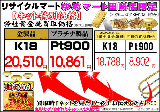 【3月18日(水曜)】本日のネット限定!!!! 金・プラチナ買取相場情報❢❢ 毎日更新ʕ•̀ω•́ʔ!! ゆめマート田崎店内1F、リサイクルマートゆめマート田崎店!!!!