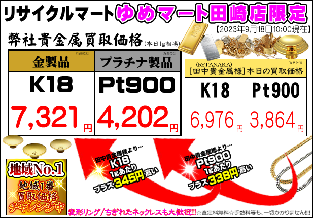 【9月18日(月曜)】本日の、金・プラチナ買取相場情報❢❢ 毎日更新ʕ•̀ω•́ʔ!! ゆめマート田崎店内1F、リサイクルマートゆめマート田崎店!!!!