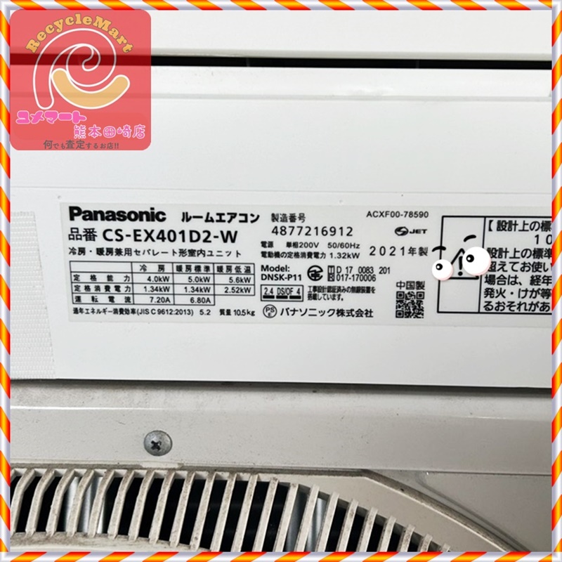 Panasonic ルームエアコン エオリア CS-EX401D2 インバーター冷暖房除湿タイプ EXシリーズ (外機:CU-EX401D2/内機:CS-EX401D2-W) 2021年製 4.0kw 中古品、無料出張買取にて買取させていただきました!!!!