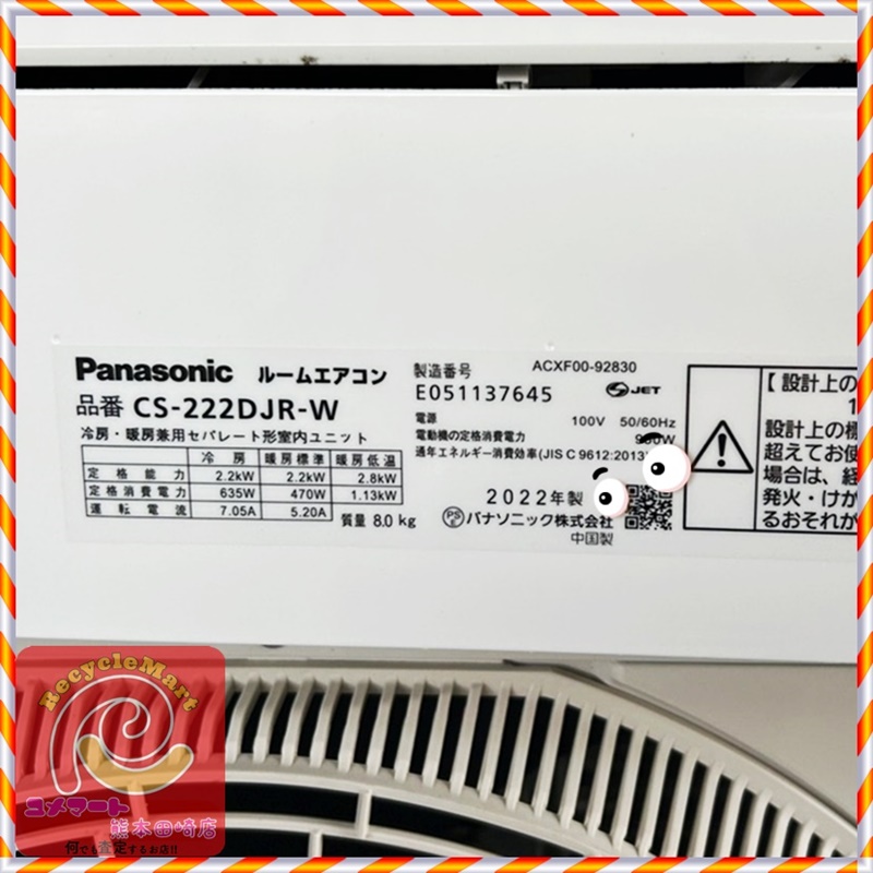 Panasonic ルームエアコン エオリア CS-222DJR DJRシリーズ (外機:CU-222DJR/内機:CS-222DJR-W) 2022年製 2.2kw 中古品、無料出張買取にて買取させていただきました!!!!