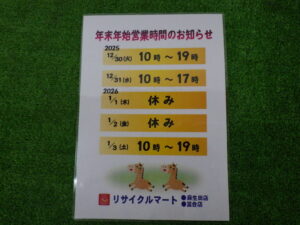 2025年→2026年の年末年始の営業時間は次のとおりとなっております。