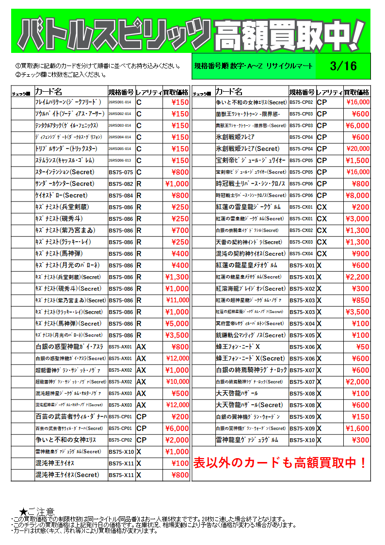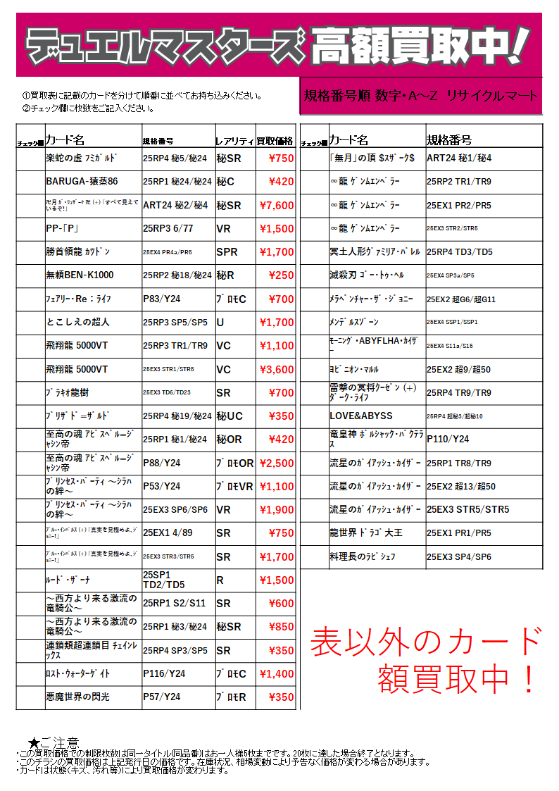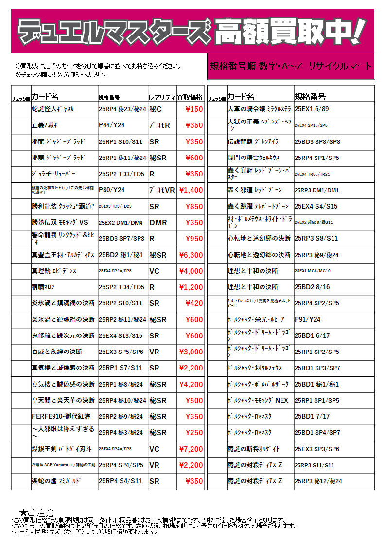 ※50枚以上の場合は、レアリティ別に分けてお持ちください。なお、お電話での価格お問い合わせにはお答えできません。