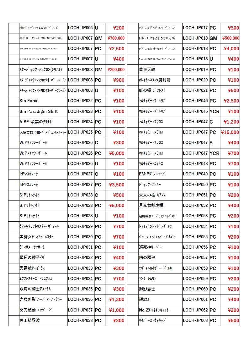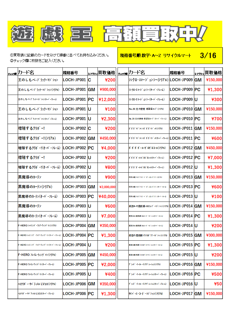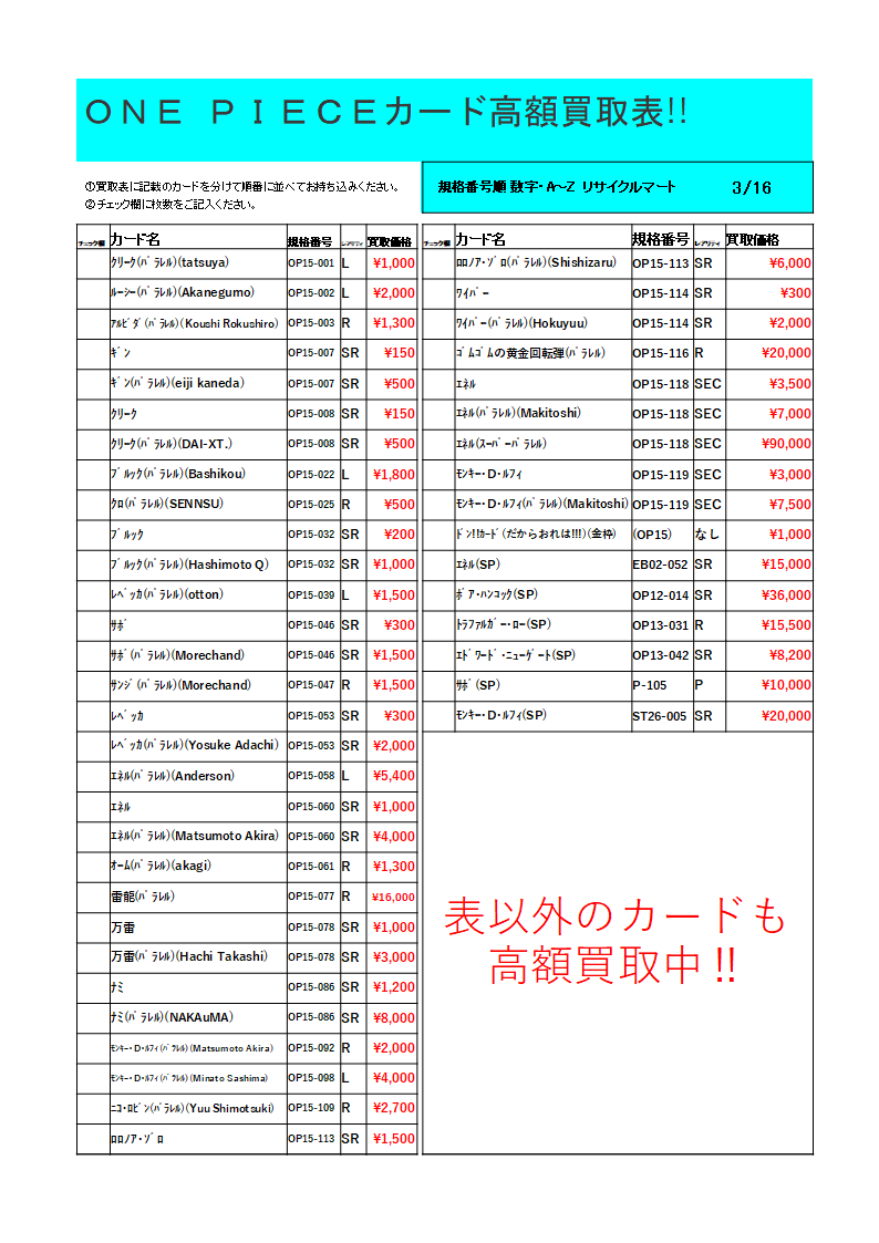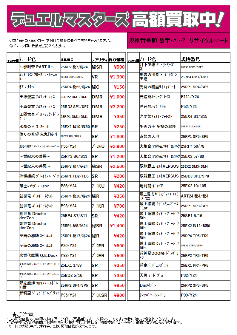 ※50枚以上の場合は、レアリティ別に分けてお持ちください。なお、お電話での価格お問い合わせにはお答えできません。