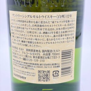 【買取実績】サントリー 白州 12年 シングルモルト ウイスキー 700ml 43%